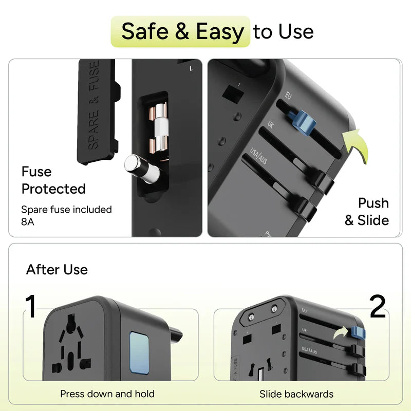 - High-Quality ABS Body: Crafted from high-quality ABS material, the adapter is both durable and lightweight. Its robust construction ensures it withstands the rigors of travel while maintaining a sleek design.